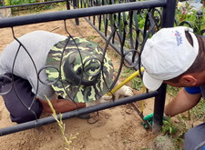 Следующим шагом мы возвели параллельно оградке периметр, обозначив границы будущего «пола» места захоронения. Разметив территорию, заменили доски металлическими полосами, которые будут выполнять роль границы для брусчатки.
