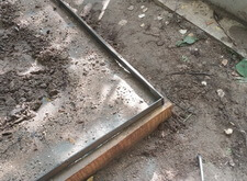 Укрепляем по периметру участка металлические планки, которые будут границей и дополнительной опорой брусчатке, свариваем их между собой и смачиваем пескобетон. Даём смеси время схватиться и немного подсохнуть.