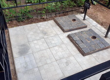 Согласно с ранее проработанным эскизом, цветники мы выкладываем брусчаткой. В середине каждого оставляем ничем не закрытую металлическую трубу: по задумке клиента трубы будут исполнять роль цветочных ваз, утопленных в землю. На этом же этапе окончательно укрепляем ограждение.