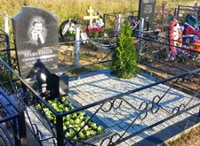 Результат работы:ограда покрашена, брусчатка уложена, бетон закрыт гранитными плитами, в цветник посажены однолетние цветы, посажена многолетняя туя, перед памятником установлены две гранитные вазы, изображение и надпись на памятнике окрашены, что не только защищает гравировку от дождя и пыли, но и делает надписи яркими и четкими.