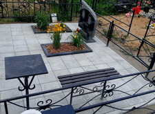 Подготовленную почву застелили геотекстилем, который будет препятствовать проростанию сорной травы в плиточных швах. В это же время на территории могилы были дополнительно установлены лавочка и столик.