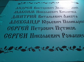 На момент нашего посещения, в храме уже находилась небольшая табличка – она была размещена неподалёку от креста и смотрелась композиция, прямо говоря, не лучшим образом. Надписи мелкие, практически не читаемые, да и сам мрамор, даже находясь в закрытом помещении, потускнел и утратил презентабельный вид.