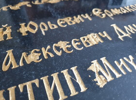 Далее снова повторяется процедура зачистки, на фотографии ниже показан конечный результат – готовая табличка, на которой нет ни следа лишнего. Каждая буковка аккуратно обработана и зачищена, на полированной поверхности гранита нет ни царапинки.